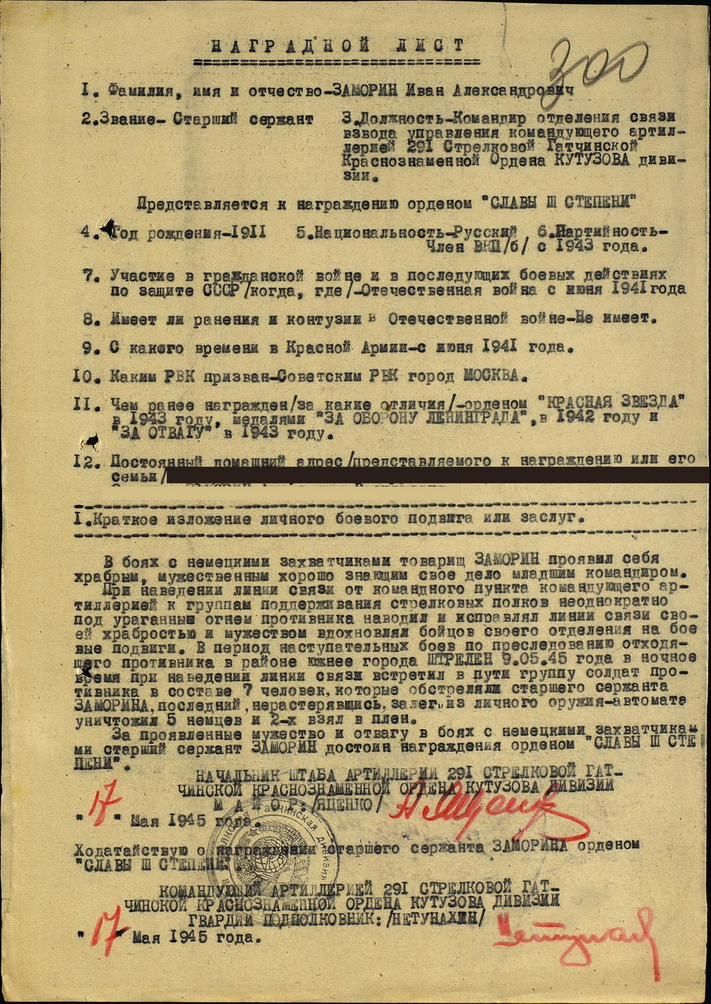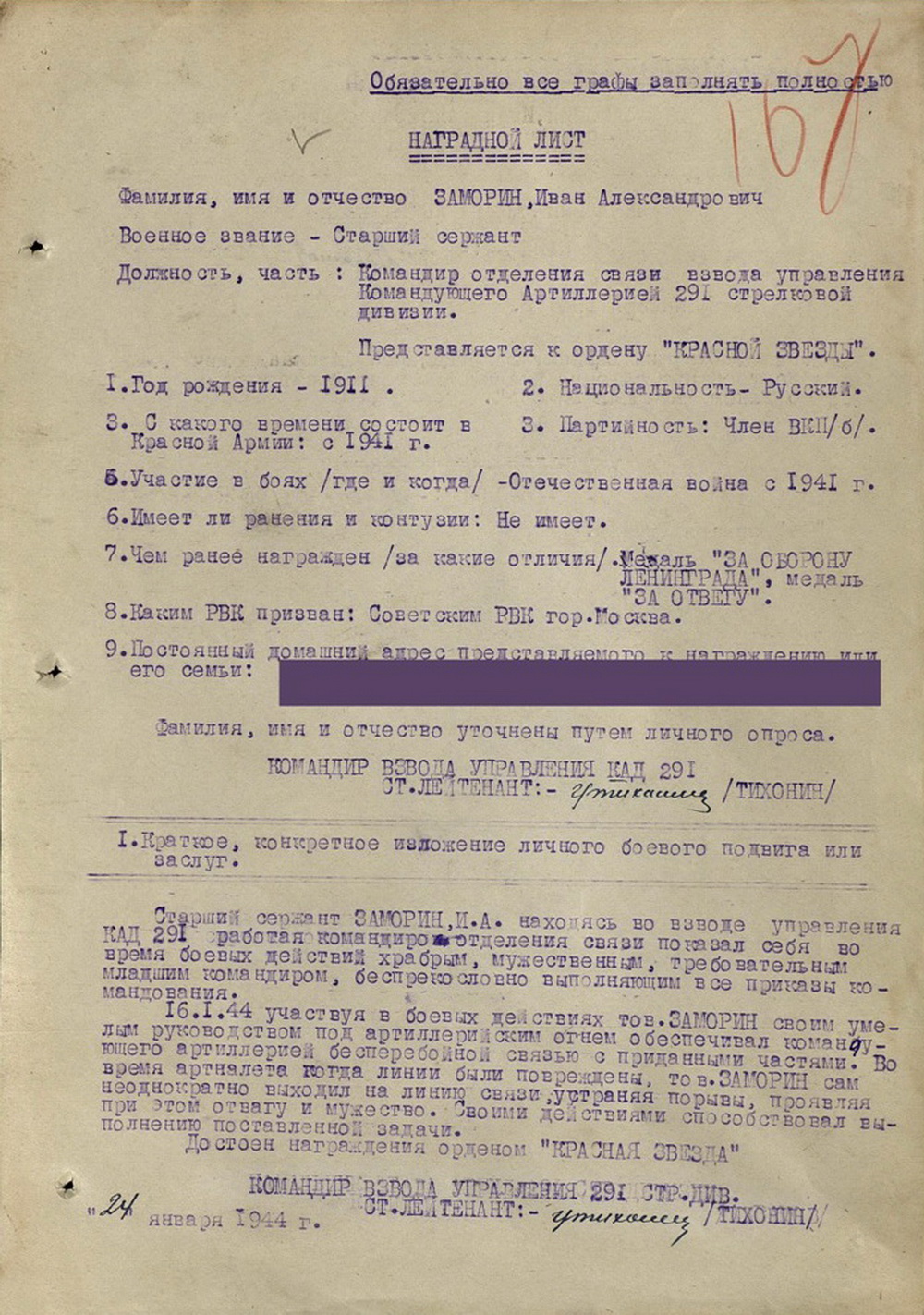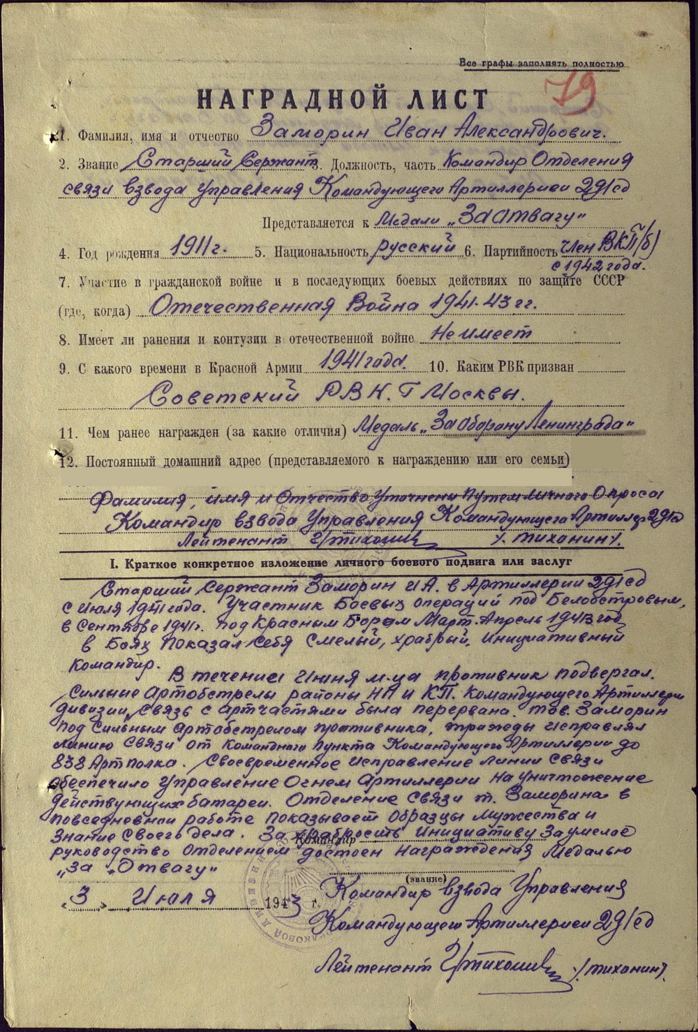 В июне 1943 г. под сильным артогнём противника ст. сержант Заморин И. А. многократно исправлял линию связи от командного пункта до 838-го артиллерийского полка. Своевременное восстановлении связи обеспечило управление огнём артиллерии на уничтожение действующих батарей.